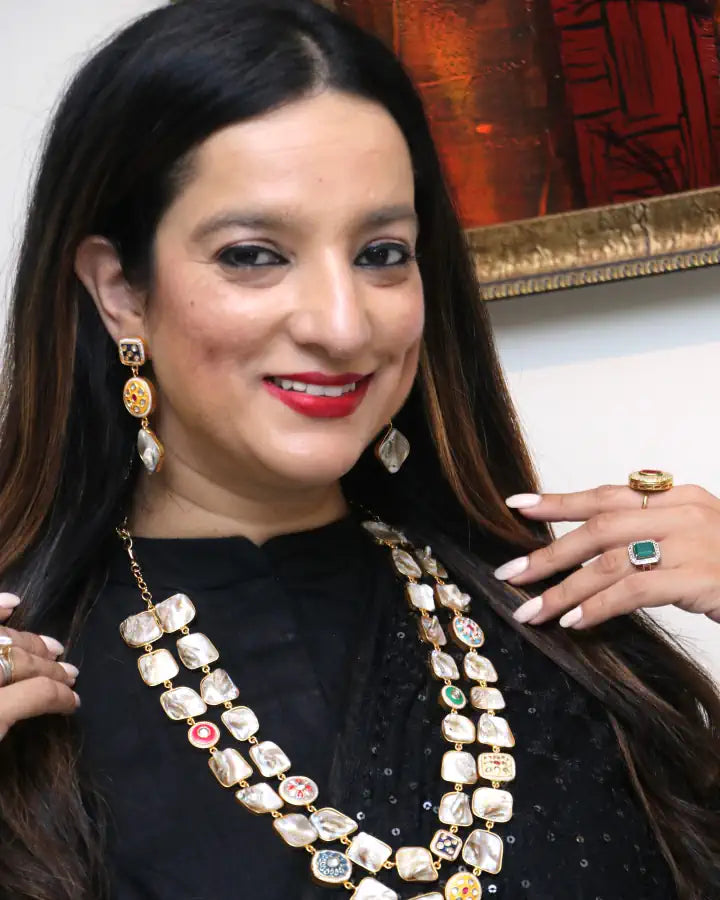 This 2 line Beautiful Mother of Pearl set with gold plated mixed shaped meenakari.The necklace...