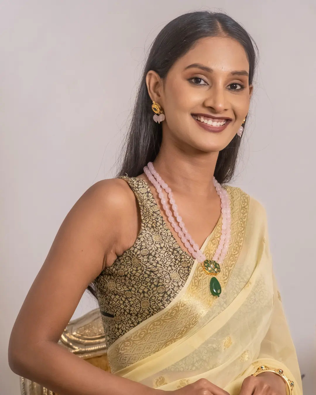 This 2 Layered Rose Quartz Jadau Pendent NecklaceΒ is Handcrafted with Rose Quartz Beads with Meenakari...