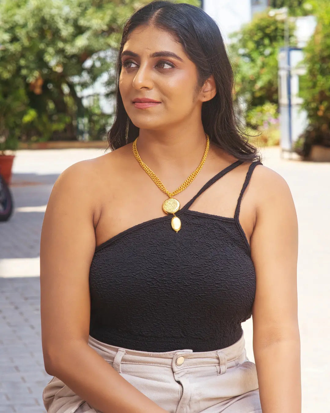 This 2 Layered Pretty Gold Tone Chain held with Round and Oval Shaped Metallic Hangings and Adjustable Hook with high quality Gold Chain Finish.