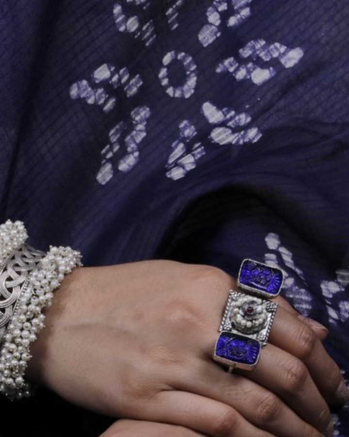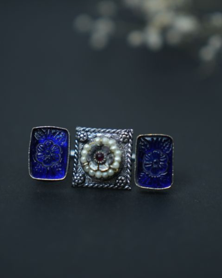 This statement 2 finger ring oxidized silver ring has dark blue natural stones with design on either side and a small red natural stone centre encircled by a moti rim. It has an adjustable front opening.