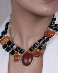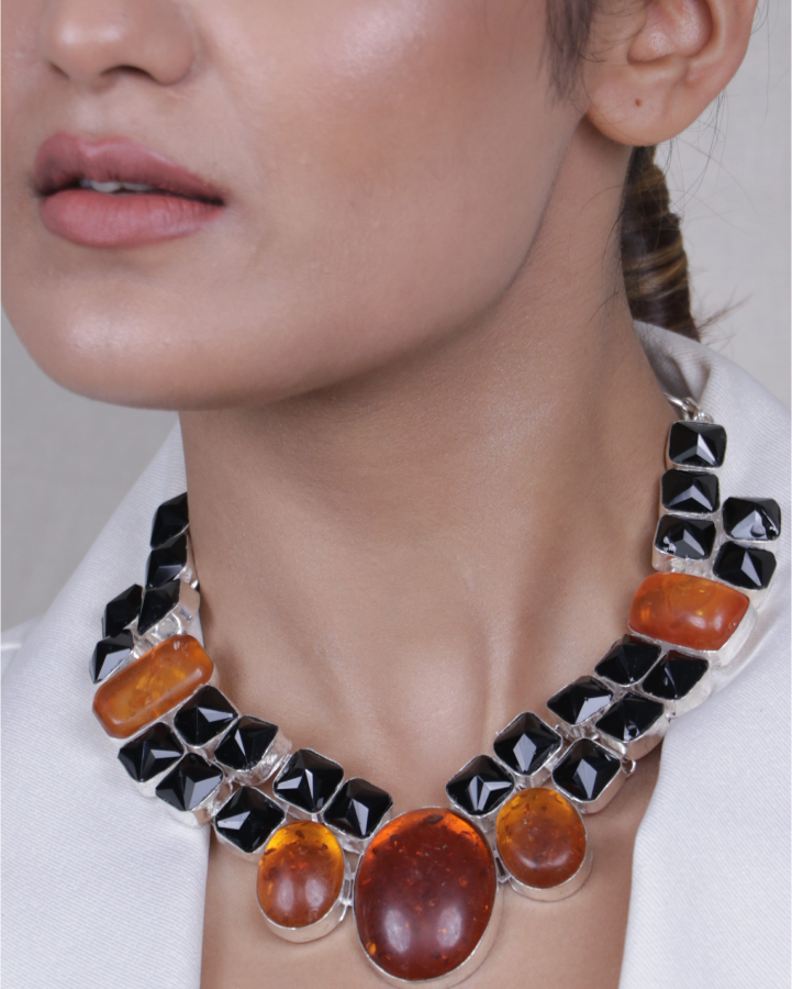 This is Bold Black and Amber Necklace Beautifully Blended into a Masterpiece for Perfect Bold Look. The Necklace has a Jade Stones with Black Square and Amber Oval Pendant made of Metallic Silver Casing. It has an Adjustable Hook with Silver Chain Finish.