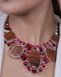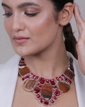 This Bold Brown Jade and Ruby Pink crystal stone Necklace is Beautifully Blended into a Masterpiece for Perfect Bold Look. The Necklace has a Brown Jade Stones with Ruby Red rectangle crystal stones and Brown Jasper Oval Pendant with Metallic Silver Casing. It has an Adjustable Hook with Silver Chain Finish.