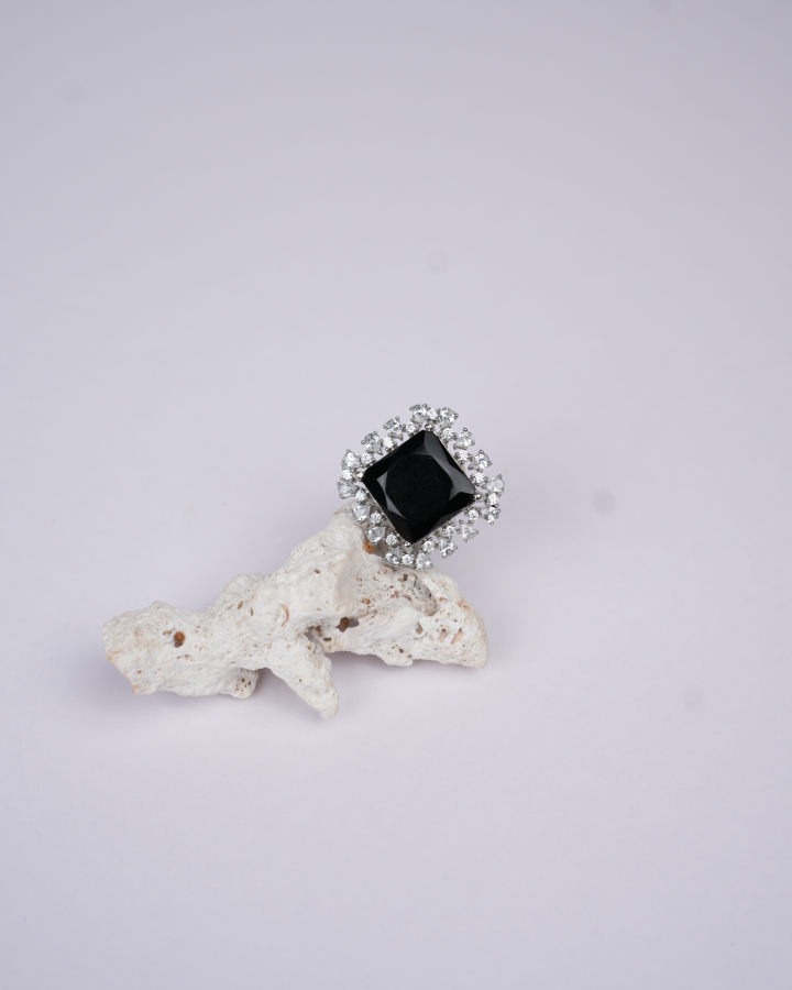 This striking black square single big stone ring, encircled by a glistening halo of white zircon stones, elegantly framed in a silver casing. Makes it a truly captivating piece of jewelry. Has an adjustable back opening, fits all sizes