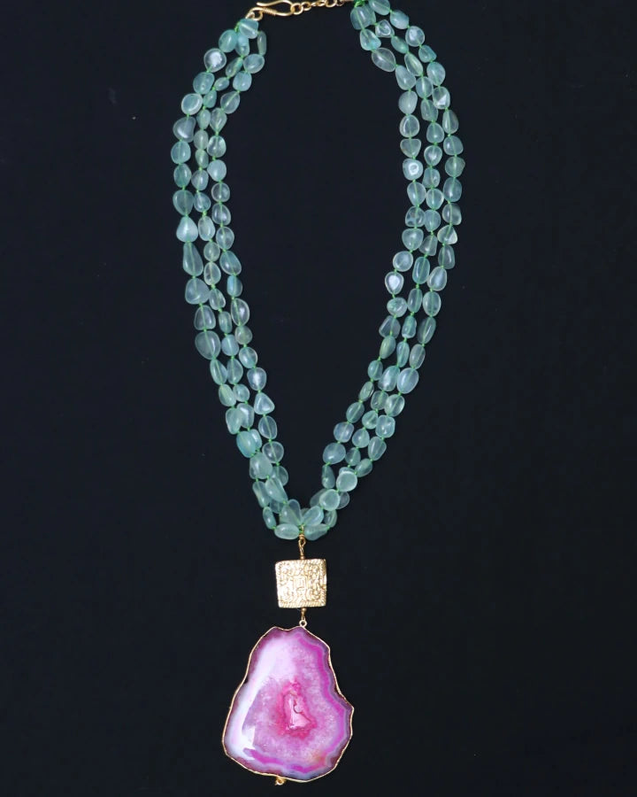 This good looking necklace is exclusively handcrafted with 3 layered pista green calsi gemstones, square gold metallic piece at the center and with unshaped Fuschia Agate stone pendant with gold casing. This necklace has a hook and a chain back finish.