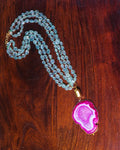 This good looking Bold Sea Green Fuschia Earth necklace is exclusively handcrafted with 3 layered pista green calsi gemstones,round gold metallic piece at the center and with unshaped Fuschia Agate stone pendant with gold casing. This necklace has a hook and a chain back finish.