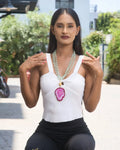 Disclaimer: The Bracelet in picture is only for styling purpose. This is not provided with the Bold Sea Green Fuschia Earth Necklace.