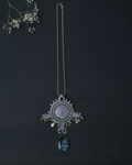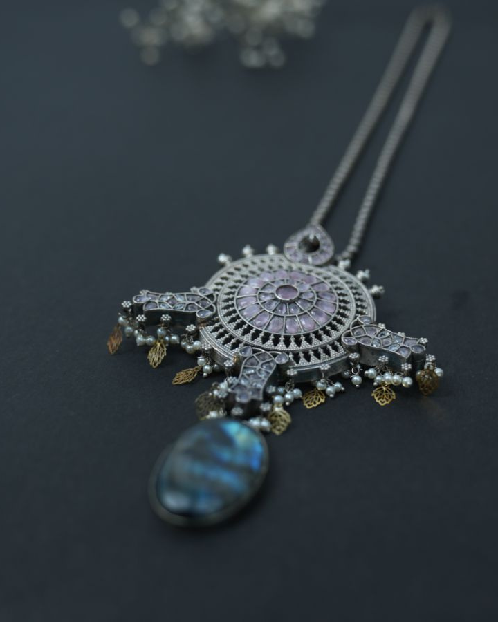 This bold statement oxidized silver chain pendant with big baby pink crystal stone setting and grey labrodarite oval stone pendant and small moti latkans in the edges . It has an adjustable chain back and opening.