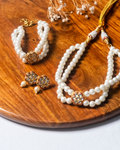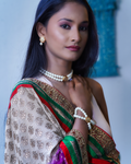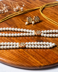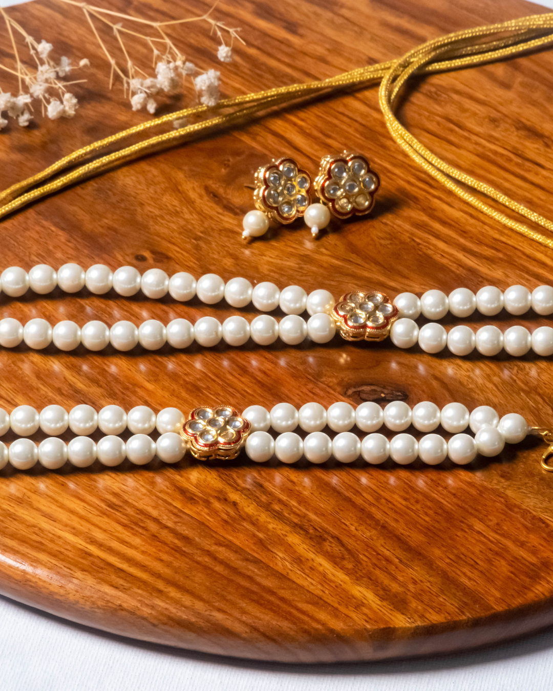 This set features a beautiful combination of a Dainty White Pearl High quality cultured pearls with lustrous sheen Choker and matching Earrings with Bracelet. This Set is made with beautiful Red Kundan Pendent with Red Meenakari(Enamel) pendent .