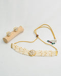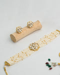 This beautiful handcrafted gold tone flower shaped kundan pendent choker .This necklace set has an adjustable dori at the back and comes with matching earring with push back.