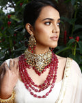 This gold finish deep red bridal set is made of bold kundans with deep red stone bead hangings along with pearl and green beaded embellishments. The set includes the necklace with an adjustable dori finish and a pair of matching earings with push pack.