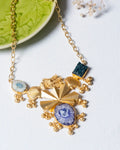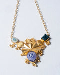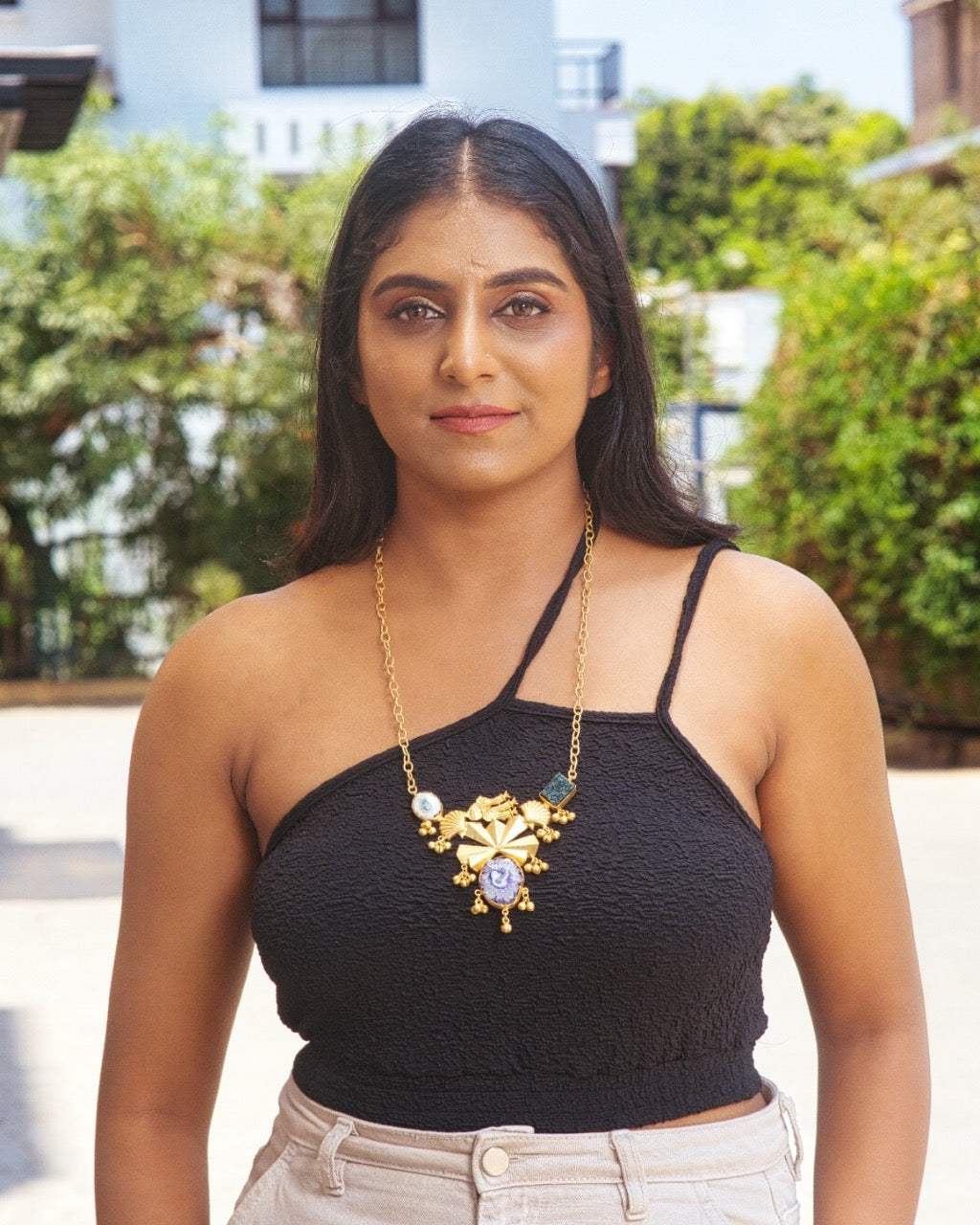 This Pretty Dull Gold Plated Pendent Necklace with Mix Metal Moti and Druzi Stone. The Necklace is held together with Gold Tone Chains with an Adjustable Hook and Chain Finish.