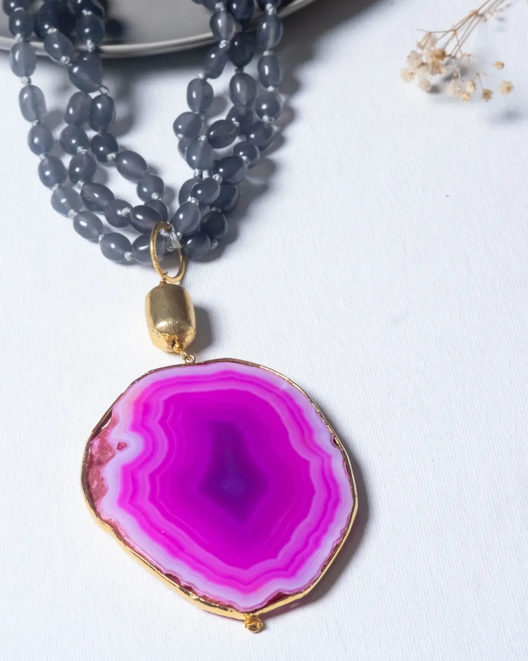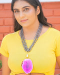 This beautiful earthy natural hues of the gorgeous unshaped agate stone crafted into a pendant to blend into a bold Earthy Coral Grey Agate beaded Long Necklace with thread connection and has a bold Fuschia Pink agate pendent in gold casing for your statement look