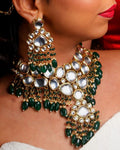 A classic bridal set with wedding green beads and kundan work. This striking necklace set is perfect to adorn the heavy bridal look.