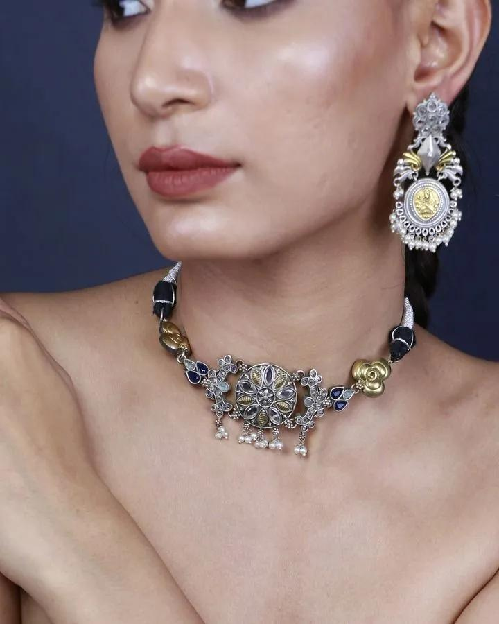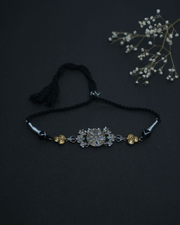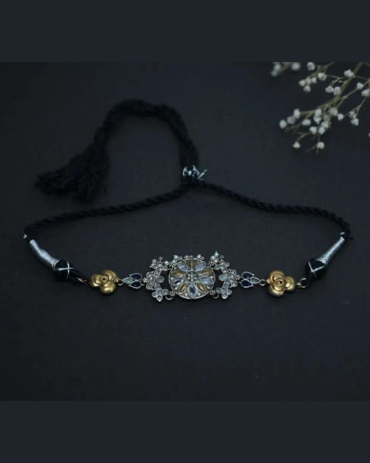 This beautiful oxidized silver choker with intricate stone work and deisgn with gold plated motifs and delicate moti hangings to complete your festive look. It comes with a black adjustable dori at the back.