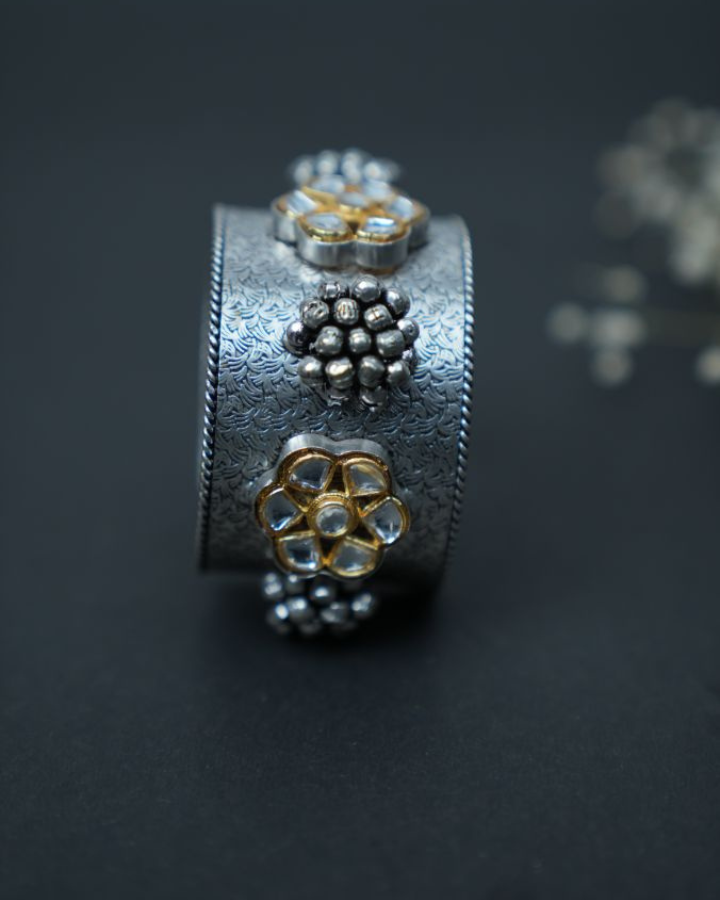 This lovely oxidized statement silver bracelet is embellished with kundan in the shape of a flower.It has a back opening that is movable.