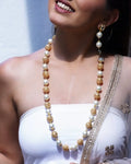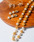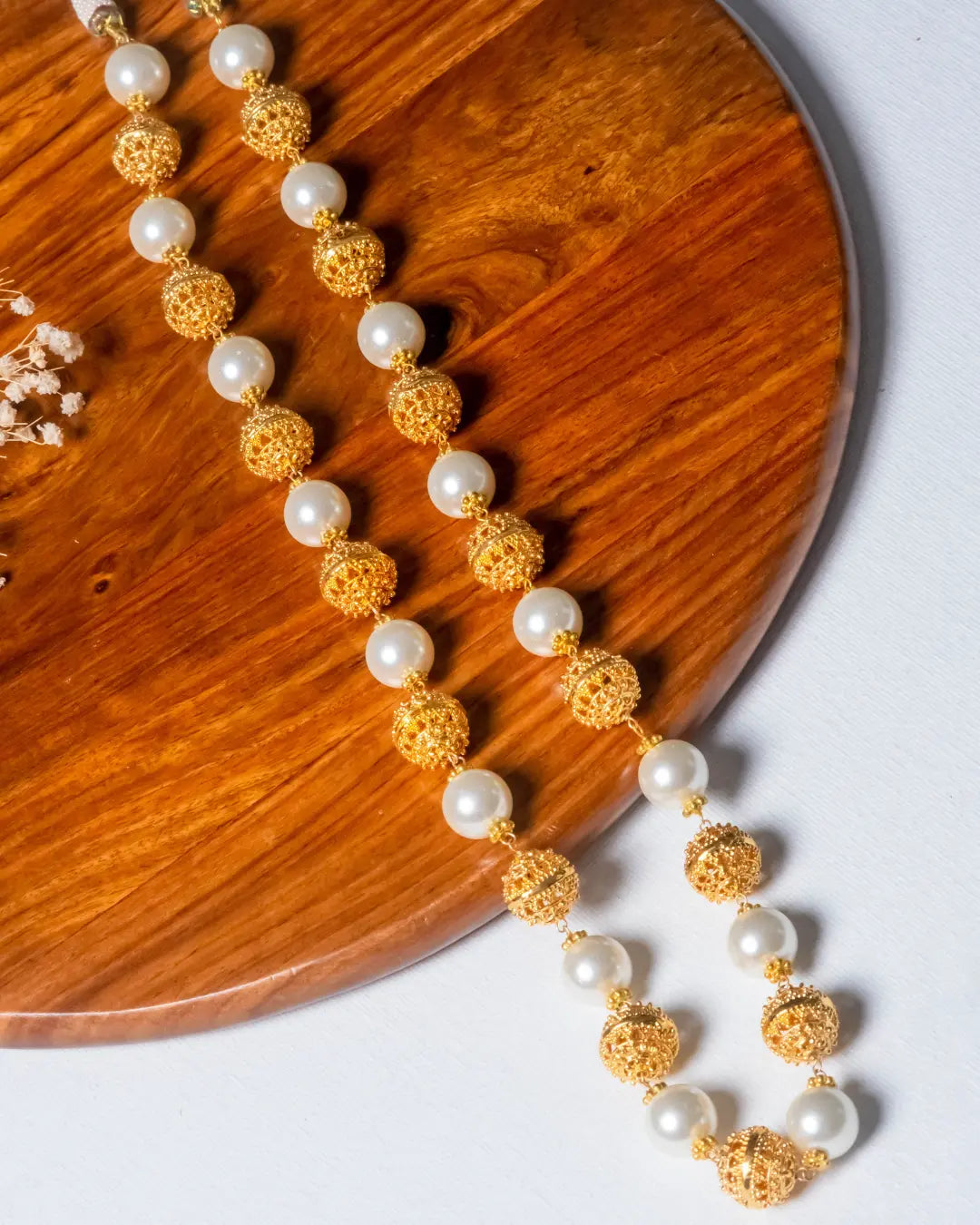 A long chain featuring alternating natural pearls and gold balls, each intricately designed with cuts or patterns for added detail and elegance. The pearls and gold balls are strung together in a continuous pattern along the length of the chain, creating a visually appealing contrast between the lustrous pearls and the shimmering gold.