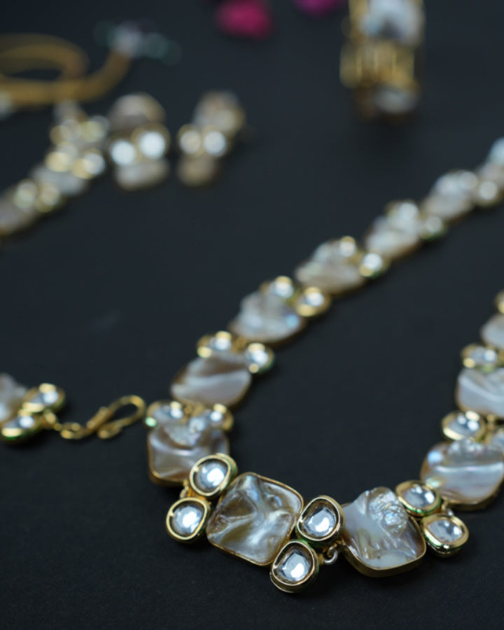 The necklace showcases the iridescence of these pearls, set in a beautifully crafted design that complements any neckline. Paired with matching earrings, the set creates a cohesive and sophisticated look. The Mother of Pearls Necklace set is a timeless and versatile accessory, perfect for adding a touch of grace and refinement to any outfit, making it a cherished addition to any jewellery collection.