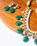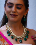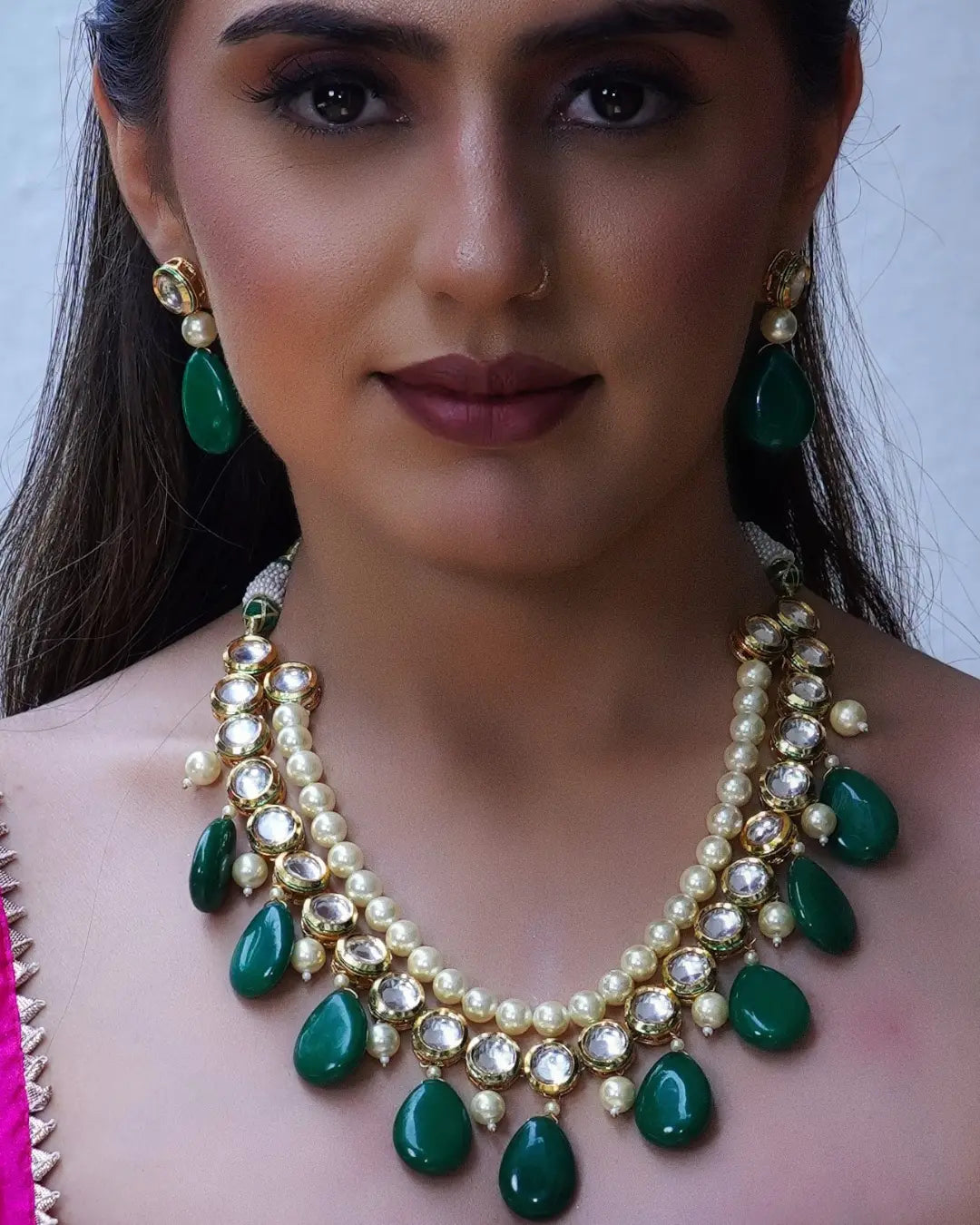 This two-layered necklace features a pearl string on one layer and natural kundan stones with large green jade drops on the other, creating a three-layered appearance. This necklace comes with adjustable dori.
