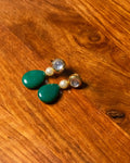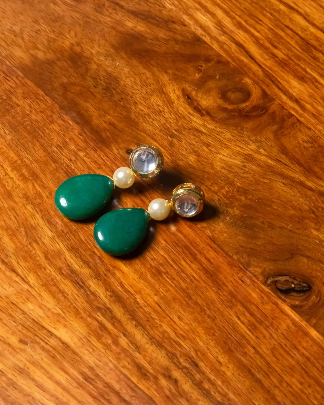 It is Paired with matching earrings, kundan stud, pearl, and jade drop. Earrings are made with pushback. The set exudes elegance and traditional charm, perfect for special occasions.