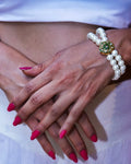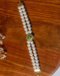 This Exquisite 2 Line bracelet comes with High quality Dainty white cultured pearls with lustrous sheen and has a beautiful Green Kundan with Green Meenakari(Enamel)pendent and with an adjustable Chain finish. Bracelet fits all sizes.
