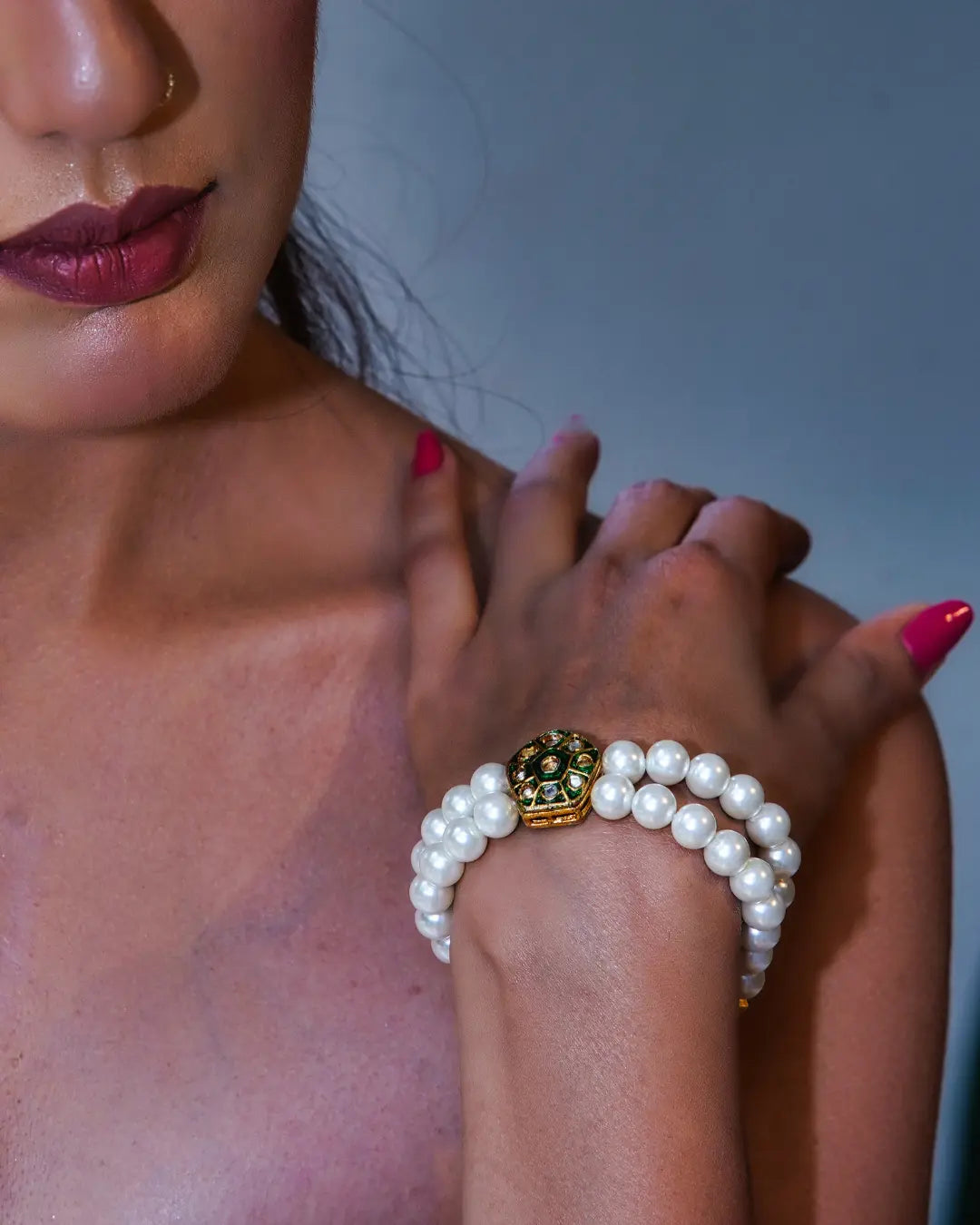 Green Meenakari with Dainty White Pearl Kundan Bracelet