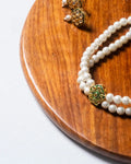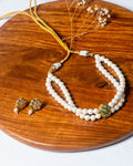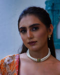 This Exquisite 2 Line High quality Choker comes with Dainty white cultured pearls with lustrous sheen and a beautiful Green Kundan with Green Meenakari(Enamel) pendent with an adjustable dori finish. This Choker Set Includes Matching Earrings. Earrings are made with Pushback.