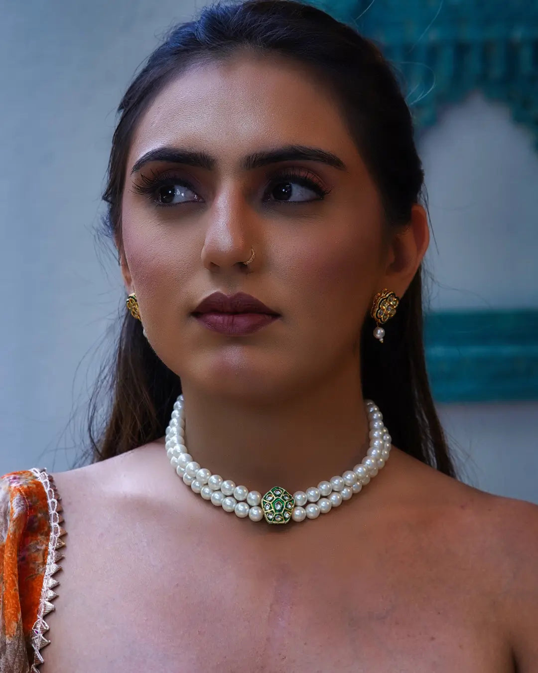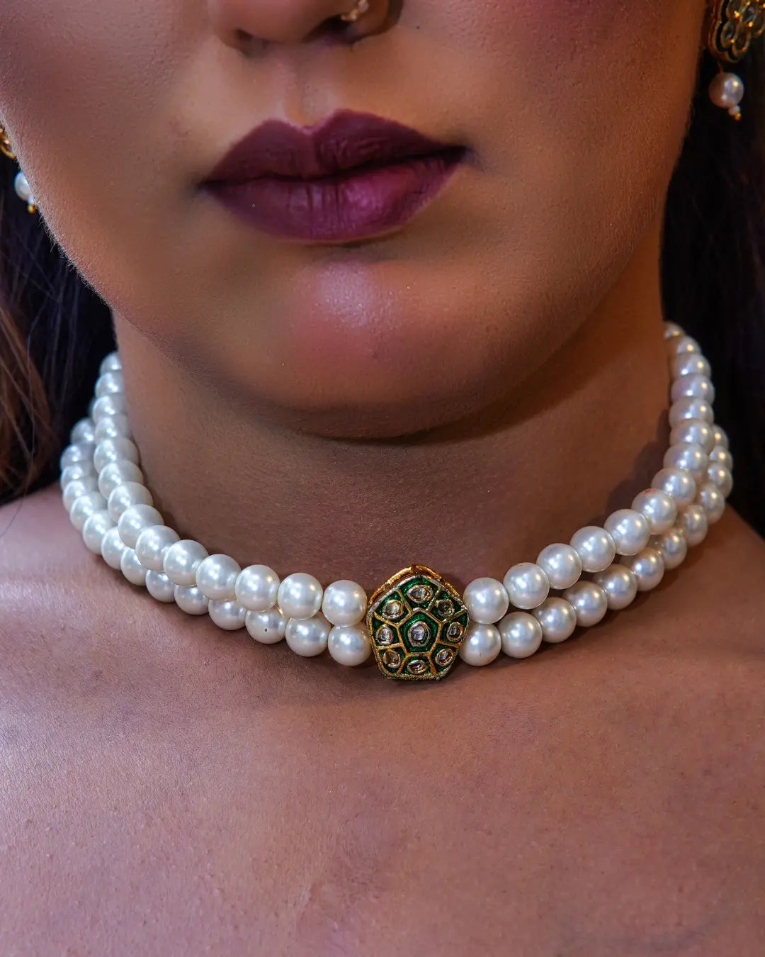 Green Meenakari with Dainty White Pearl Kundan Choker