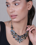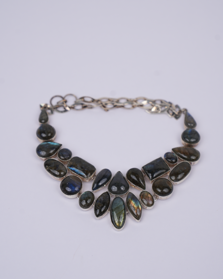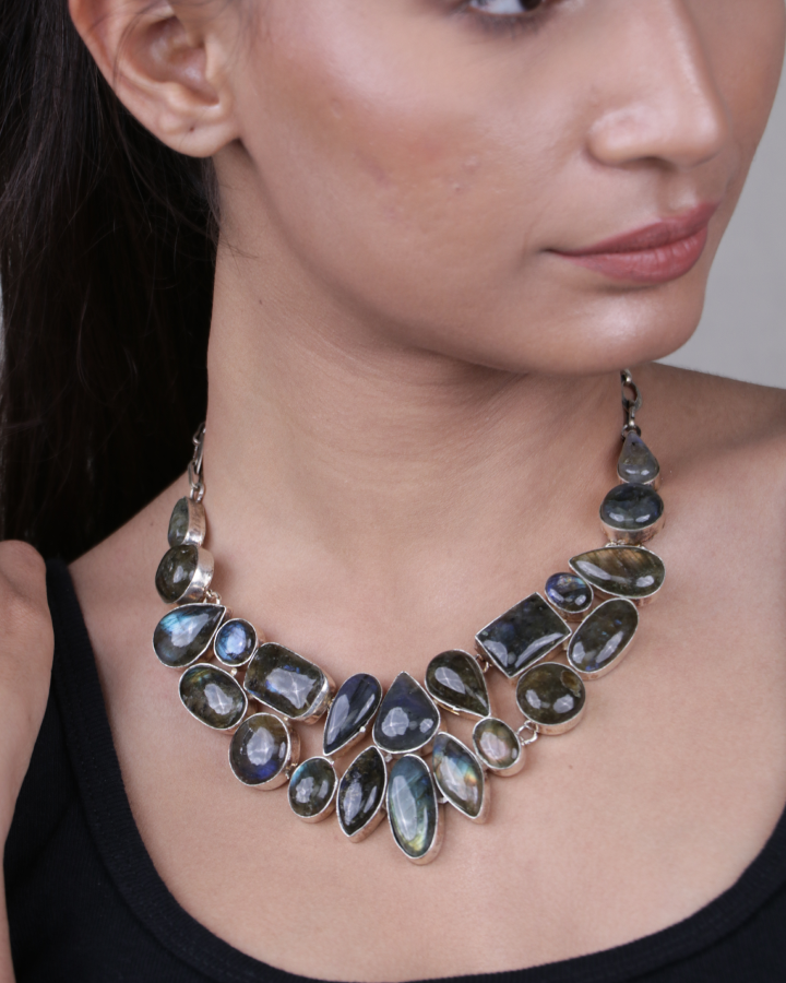 This beautiful Labradorite Necklace is Blended into a Masterpiece for Perfect Bold Look. The Necklace has Different Shaped Grey and Black Labradorite Stone made in Metallic Silver Casing with an Adjustable Hook Silver Chain Finish.