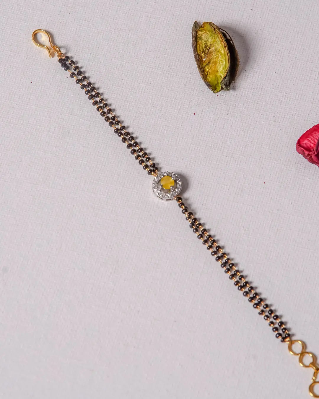 This delicate black bead Bracelet with lemon yellow stone is made up of tiny black beads and lemon Yellow Stone surrounded by the zircon glittering stones. It has an adjustable hook. The shining and gorgeous stones add allure, making it a valuable addition to your jewelry collection, perfect for enhancing your style with grace.Ensuring a perfect fit for anyone who wears it.