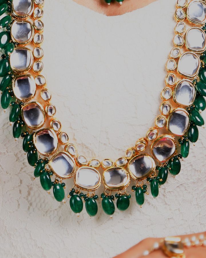 This product includes a long necklace with bold Kundans and dark green stone bead dangles. It has an adjustable dori finish.