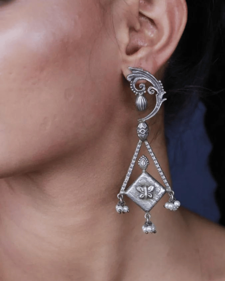 These stylish incredible long dangling light weight oxidized silver earrings along with moti drop hangings. The earrings are made with a push back