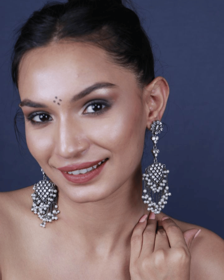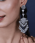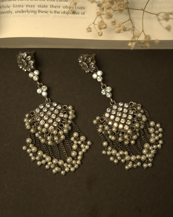 These extravagent long oxidized light weight vintage style earrings are made with crystal stones and moti hanging in black metallic chains . The earrings are made with a push back