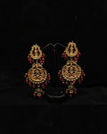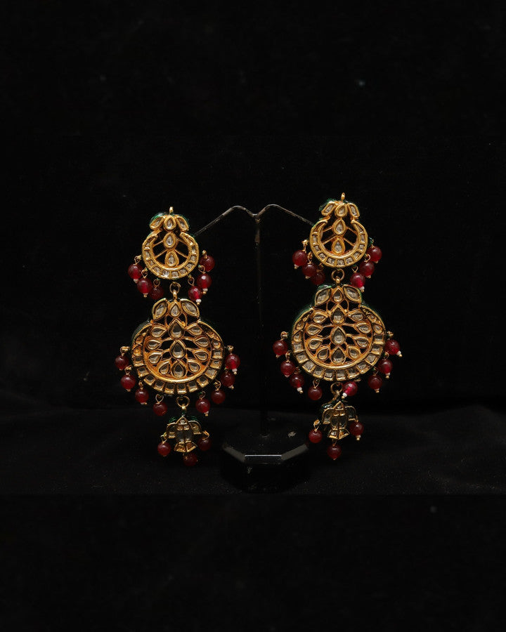 This Regal long necklace set is made up of five lines of finely cut round shaped semi precious ruby stones with gold plated kundan connectors in between and chandbali style kundan pendent with ruby latkan and matching long earrings . Earrings are made with push back. Necklace has adjustable dori.