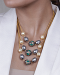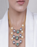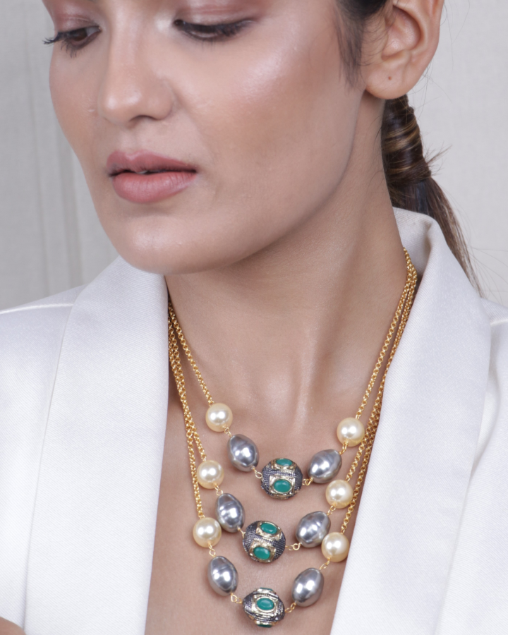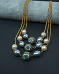 This 3 layered beautiful necklace is handcrafted with the artistic marcasite central round beads with green and light gold pearl beads on the sides. The necklace is held together with gold tone chains with an adjustable hook and chain finish.