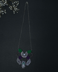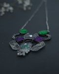 This big bold oxidized silver pendant with purple , green and turquoise natural quartz to add a pop of colour to your festive look. It has an adjustable chain back and opening.