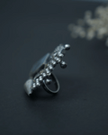 This ravish light weight oxidized silver ring with mixed design motives featuring whitemother of pearl stone . It has an adjustable back.