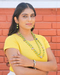 This Neon Green Fusion Necklace is Handcrafted with Green Onyx Beads with High Quality Gold Plated Wire Connection. It has Different Shaped Metallic Beads with Different Colour Stones. The Necklace is held together with Gold Tone Chains with an Adjustable Hook .This Necklace has Matching earrings with push-back .