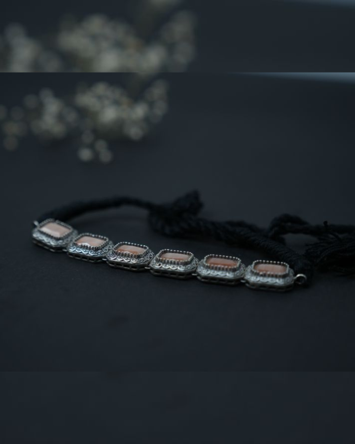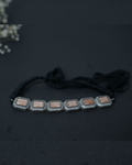 This gorgeous orange natural rectangle shape stone in centre with oxidized silver rims choker to elevate your festive look. It comes with a black adjustable dori at the back.