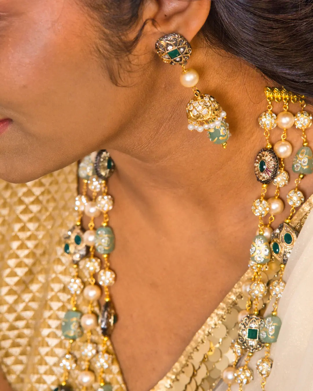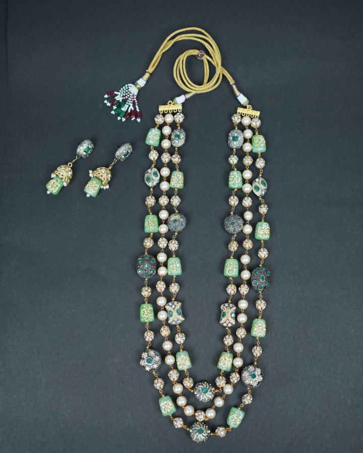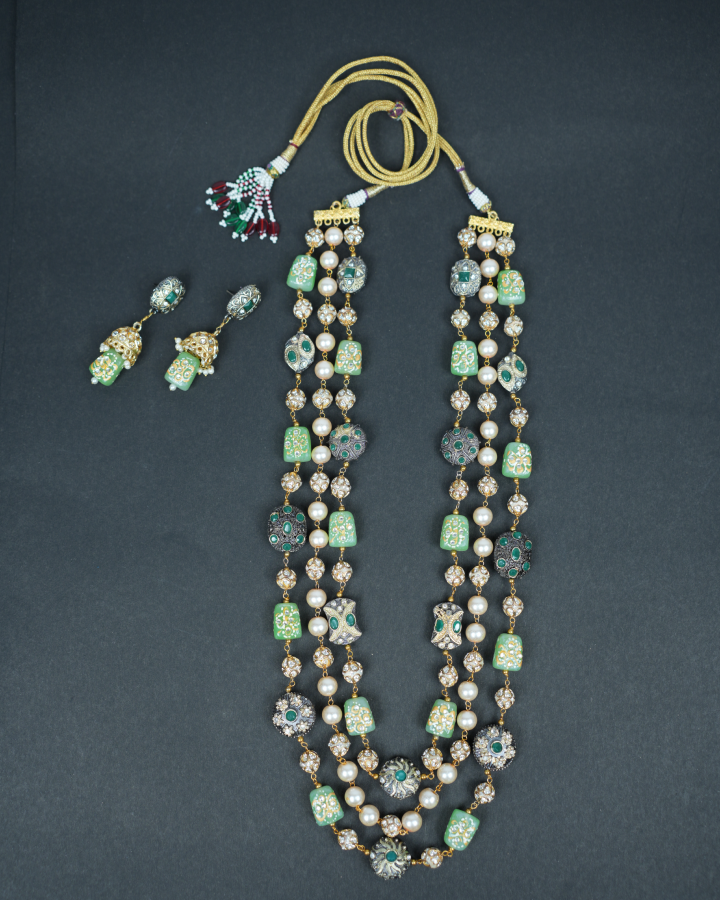 This exquisite 3 Layered Necklace featuring Pastel Green Colour handcrafted Stone Beads with intricate jadau work and cultured Gold colour Pearls, Crystal Beads and metallic Marcasite Beads which are strunk with high quality Gold plated wire connections. This Long necklace has a adjustable dori and matching jumka earrings with push back.