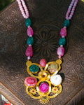 This Pretty Pink Mixed Agate Stone Necklace made with 2 line pink beads and green beads . The pendent is made with Dull Gold Plated Metalic Pendent with mixed stones .it has adjustable finishing.