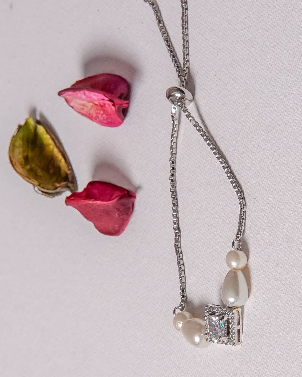 This Radiant Pearl Bracelet with Big square Zircon Stone features a central diamond shaped Zircon White stone surrounded by tiny zircon stones, complemented by a silver adjustable chain.