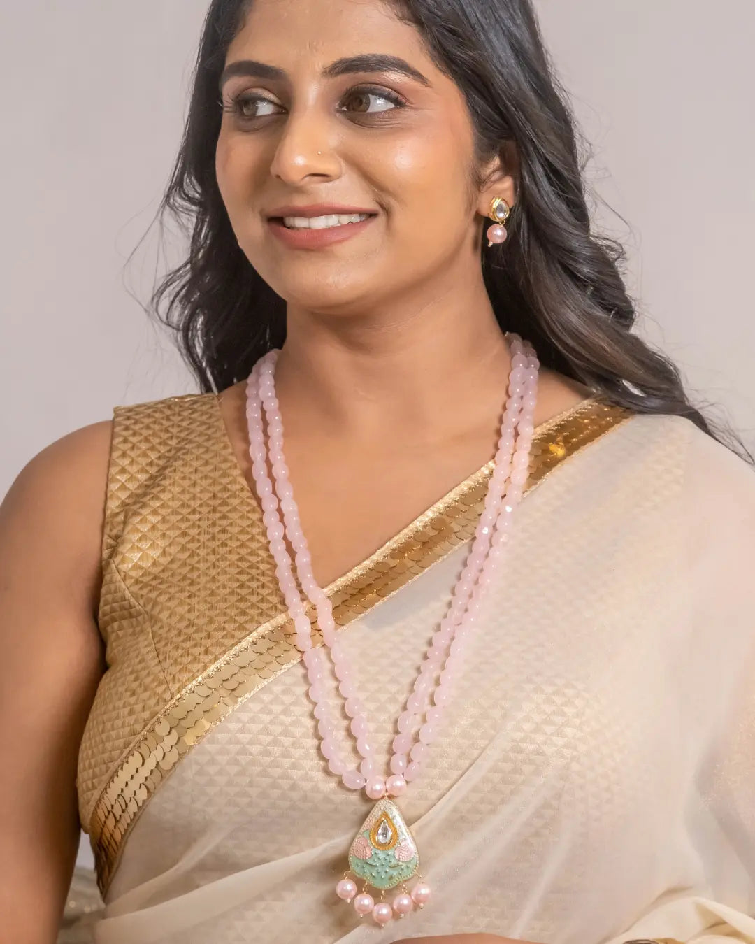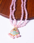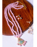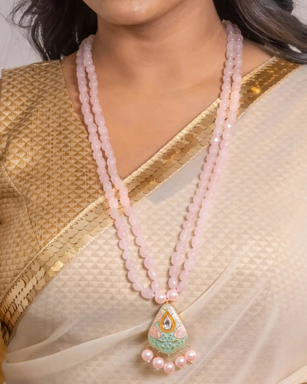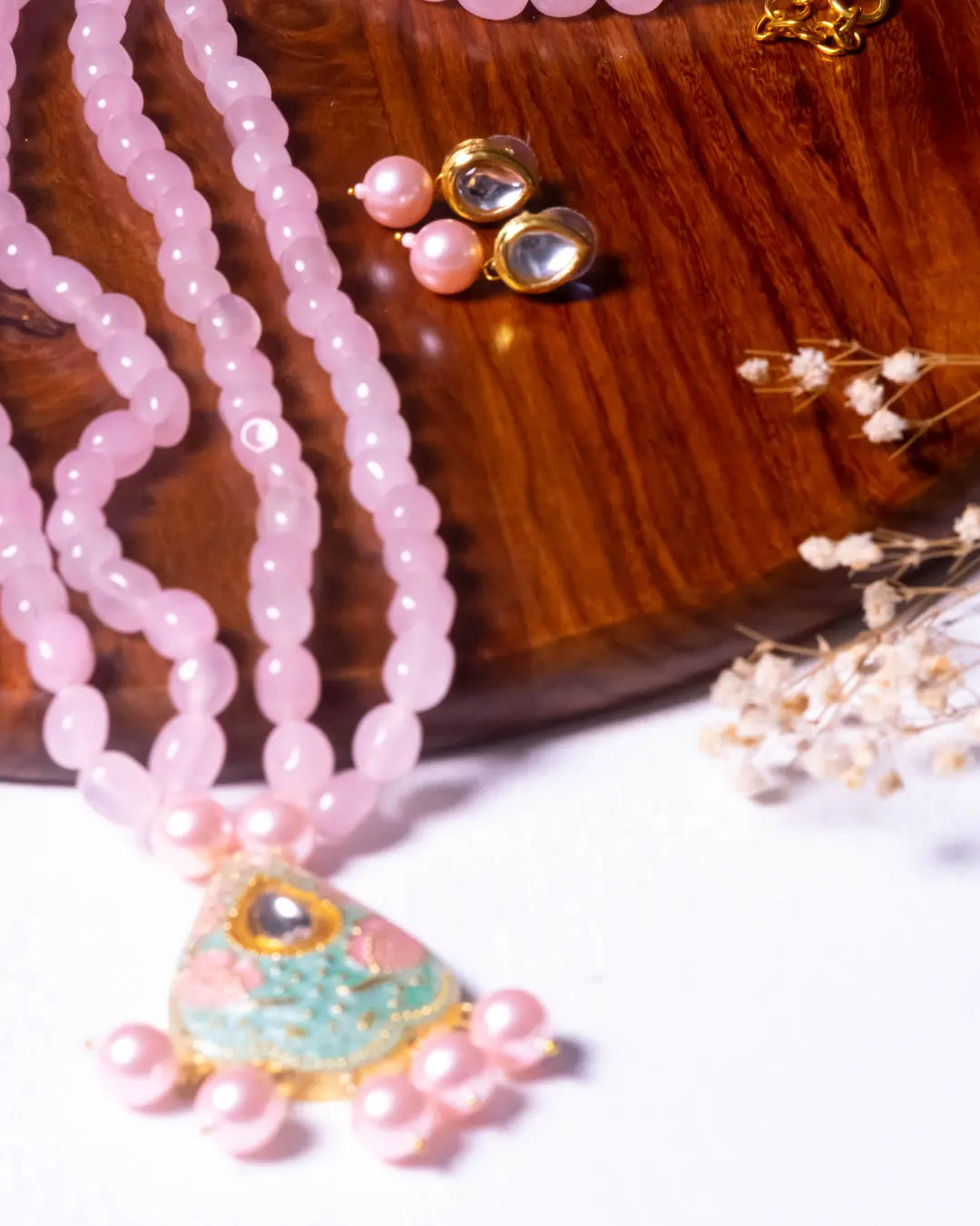 is Handcrafted with Rose Quartz Beads with Meenakari ( Enamel) pendent in pista green and pink colour and Kundan Stone in centre and Pearl Hanging. The Necklace is held together with Gold Tone Chains with an Adjustable Hook Finish.This Necklace has Matching earrings with push-back.