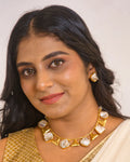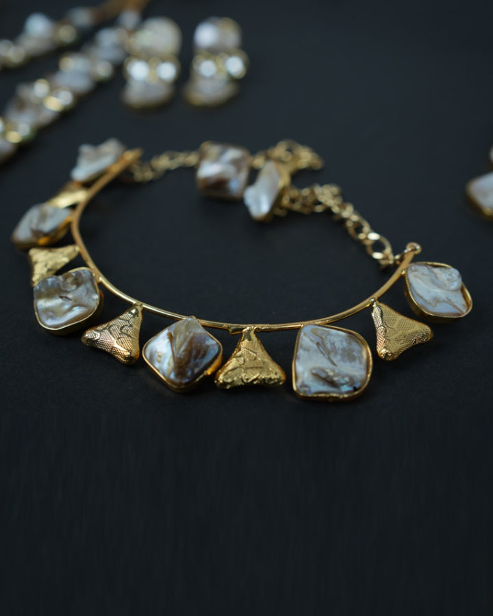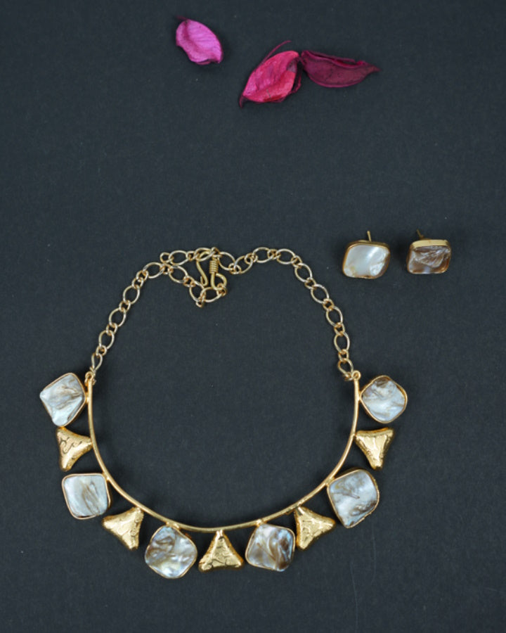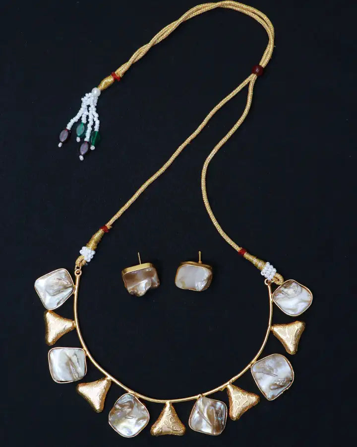 This pretty Mother of pearl necklace set with triangle shaped gold pieces connected with a gold tone metallic wire frame. This set includes a pair of earrings with push back. Necklace has adjustable dori.