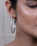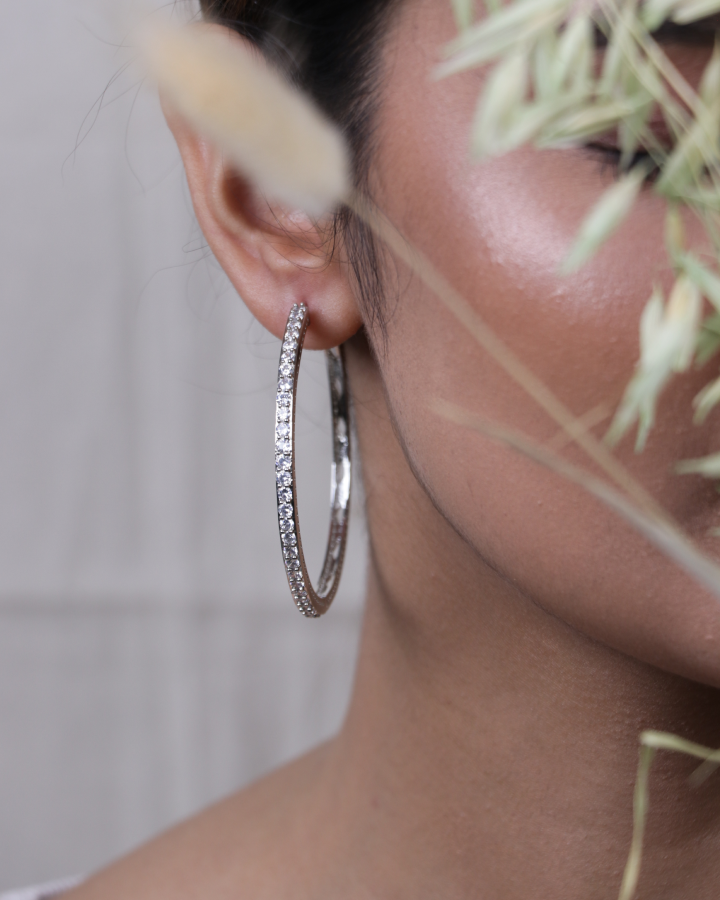 Stunning silver-plated loop earrings adorned with sparkling zircon stones, a perfect blend of elegance and sophistication