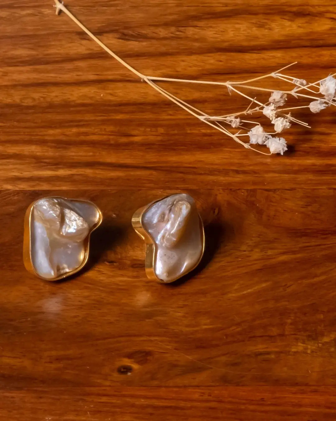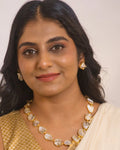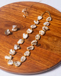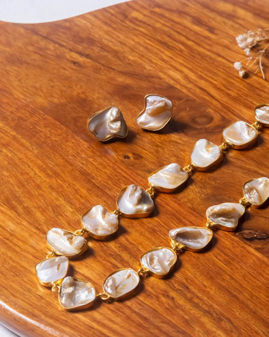 This exquisite beautiful Mother Of Pearl Necklace is made of unshaped Mother Of Pearl with Gold plated casing. It has Gold Wire Connection. The necklace showcases the iridescence of these pearls, set in a beautifully crafted design that complements any neckline. Paired with matching earrings. Earrings are made with pushback. Necklace has adjustable Chain Finish.