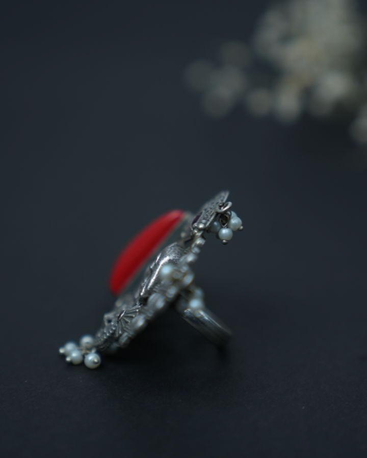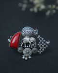 This multi design statement elephant oxidized silver ring with along with natural stones. It has an adjustable back. Fits all sizes