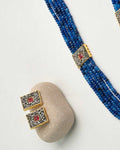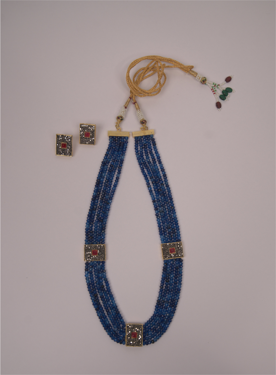 This exquisite 5 line Blue Sapphire Necklace with 3 square Marcasite motifs in between has dori finish and earrings with push back.