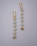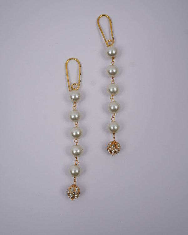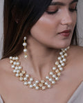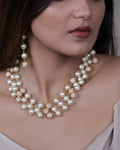 This necklace is made with white cultured pearls and crystal stone beads connected with gold plated wire workmanship . It has an adjustable Gold chain finish at the back . It has loop matching earrings with crystal bead drops .