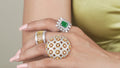 This cocktail gold plated ring, meticulously adorned with intricate carved designs and enriched by the brilliance of zircon stones delicately set at both ends, combining bold elegance with exquisite craftsmanship.